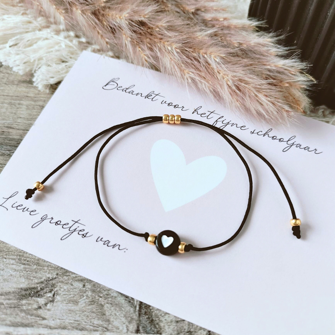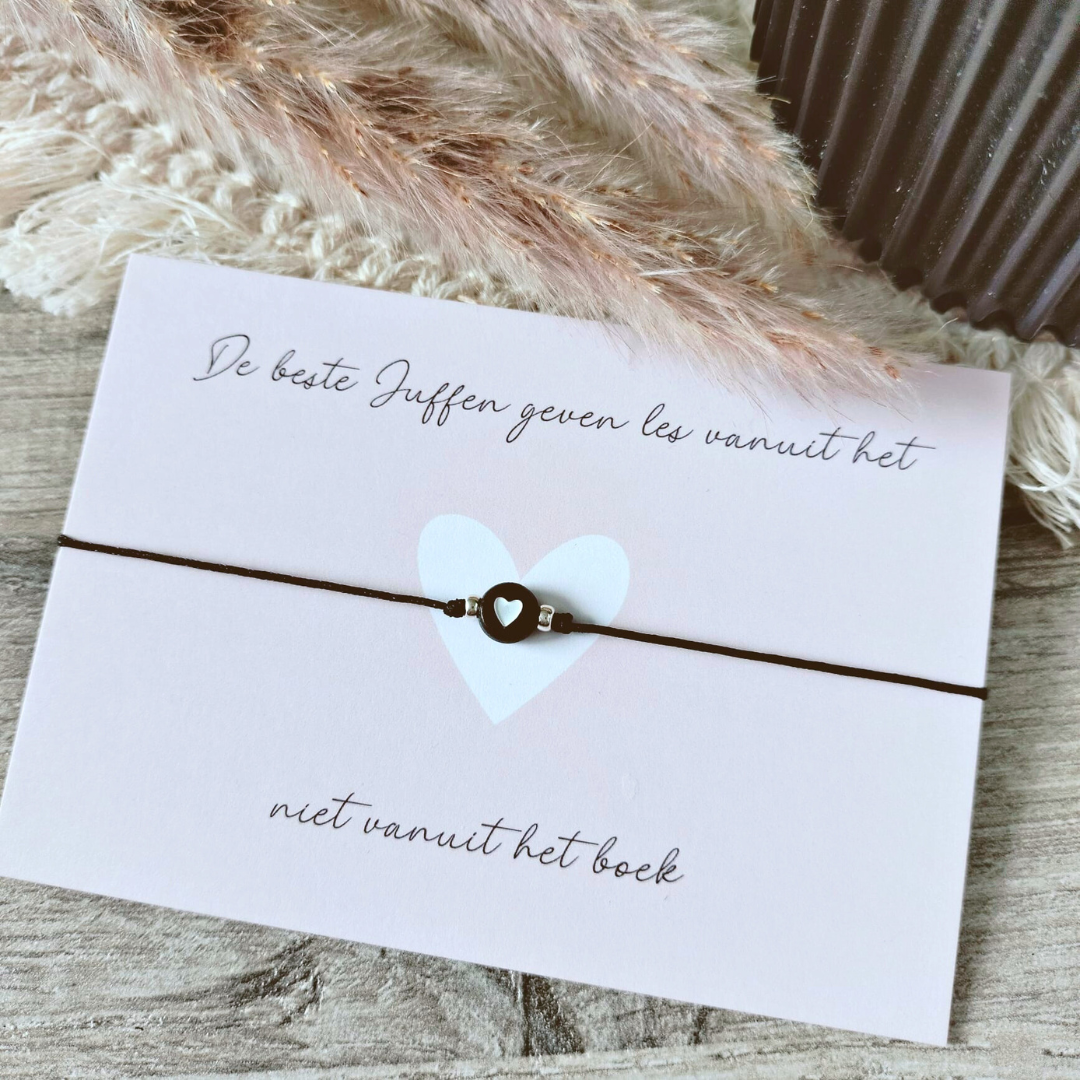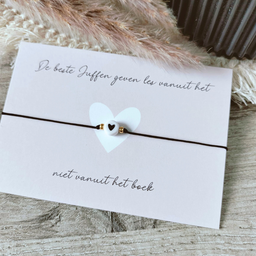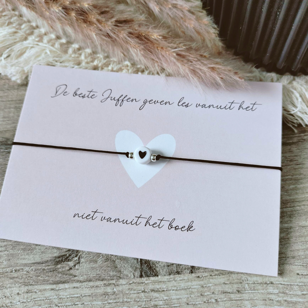 Dan is dit handgemaakte juffenarmbandje met een hartje precies wat je zoekt – een klein gebaar dat veel zegt.