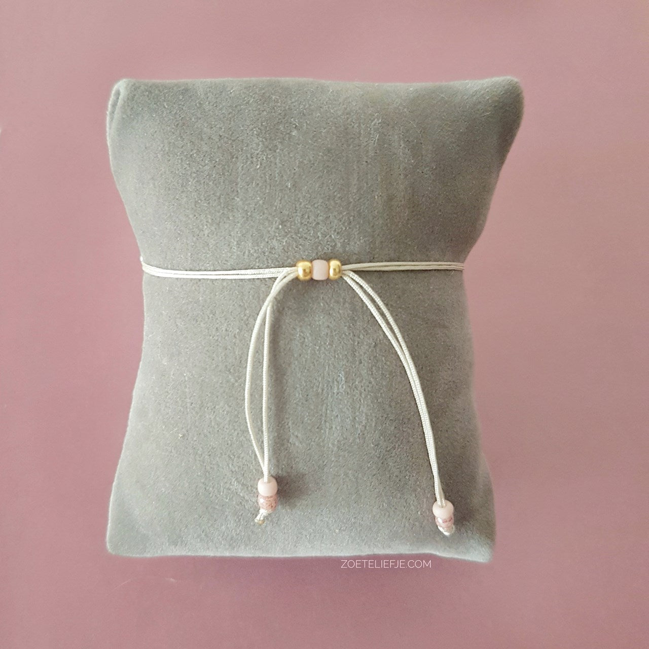 Dit elegante koord armbandje is met zorg samengesteld met Miyuki glaskralen en facetkraaltjes in zachte roze- en paarstinten, gecombineerd met een witte letterkraal met goudkleurige letter. Een subtiel, handgemaakt sieraad dat jouw persoonlijke verhaal draagt.